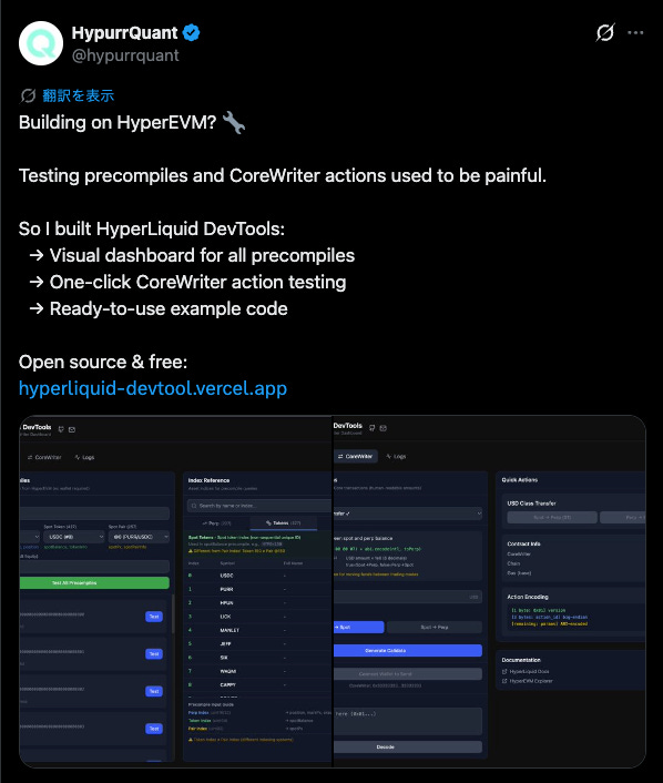 HypurrQuantは、HyperEVM上での開発体験向上にフォーカスするビルダーアカウントです。今回、HyperEVMでのprecompileやCoreWriter actionのテストが煩雑だった課題を受け、HyperLiquid DevToolsを開発・公開。precompileを一覧で確認できるビジュアルダッシュボード、CoreWriter actionのワンクリックテスト機能、即利用可能なサンプルコードを備えたオープンソースかつ無料の開発支援ツールとなっています。HyperEVMエコシステムにおける開発初期コストの低減を狙った実践的アップデートです。