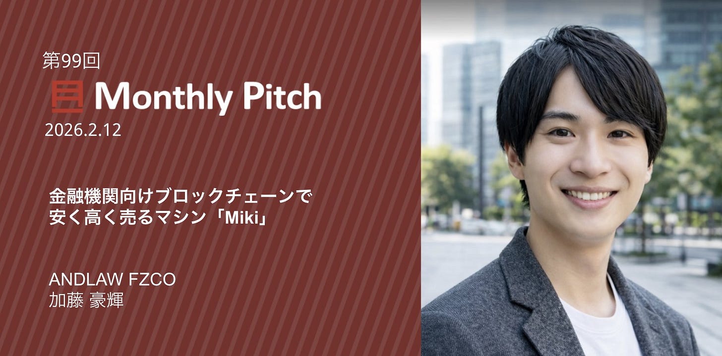 Miki(ANDLAW FZCO)は、金融機関向けにブロックチェーンを活用した取引最適化ソリューションを開発するプロジェクトです。今回、第99回 Monthly Pitchに登壇し、「ブロックチェーンで安く高く売るマシン『Miki』」をテーマに発表を実施。代表の加藤 豪輝氏が登壇し、既存金融機関に向けた取引効率化・コスト削減・価格最適化を実現するプロダクトコンセプトを紹介しました。伝統金融とブロックチェーン技術を接続する実装レイヤーとしてのポジショニングが注目されます。