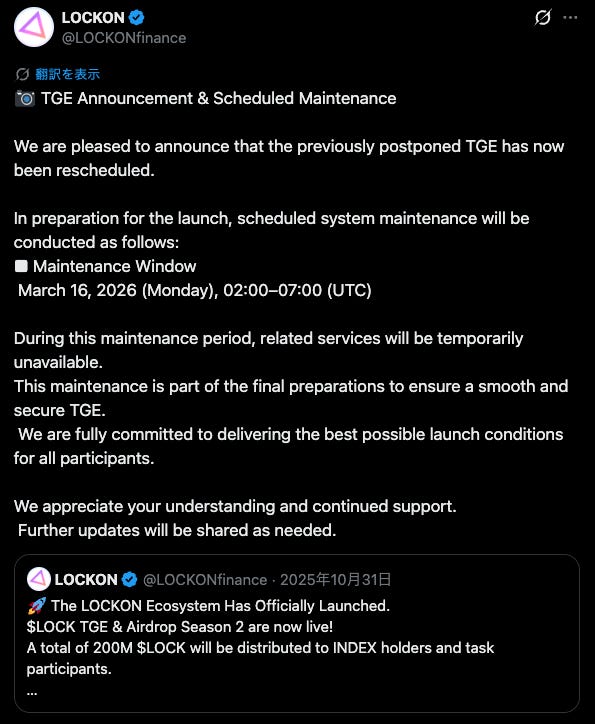 LOCKONは、エコシステムトークン$LOCKを中心にプロダクト展開を進めるWeb3プロジェクトです。今回のニュースでは、これまで延期されていたTGEの再スケジュールを正式発表。ローンチ準備の最終段階として、2026年3月16日 02:00–07:00(UTC)にシステムメンテナンスを実施し、期間中は関連サービスを一時停止すると告知しました。安全かつスムーズなTGE実行に向けた最終調整であることを強調しており、参加者に向けて今後も随時アップデートを共有するとしています。