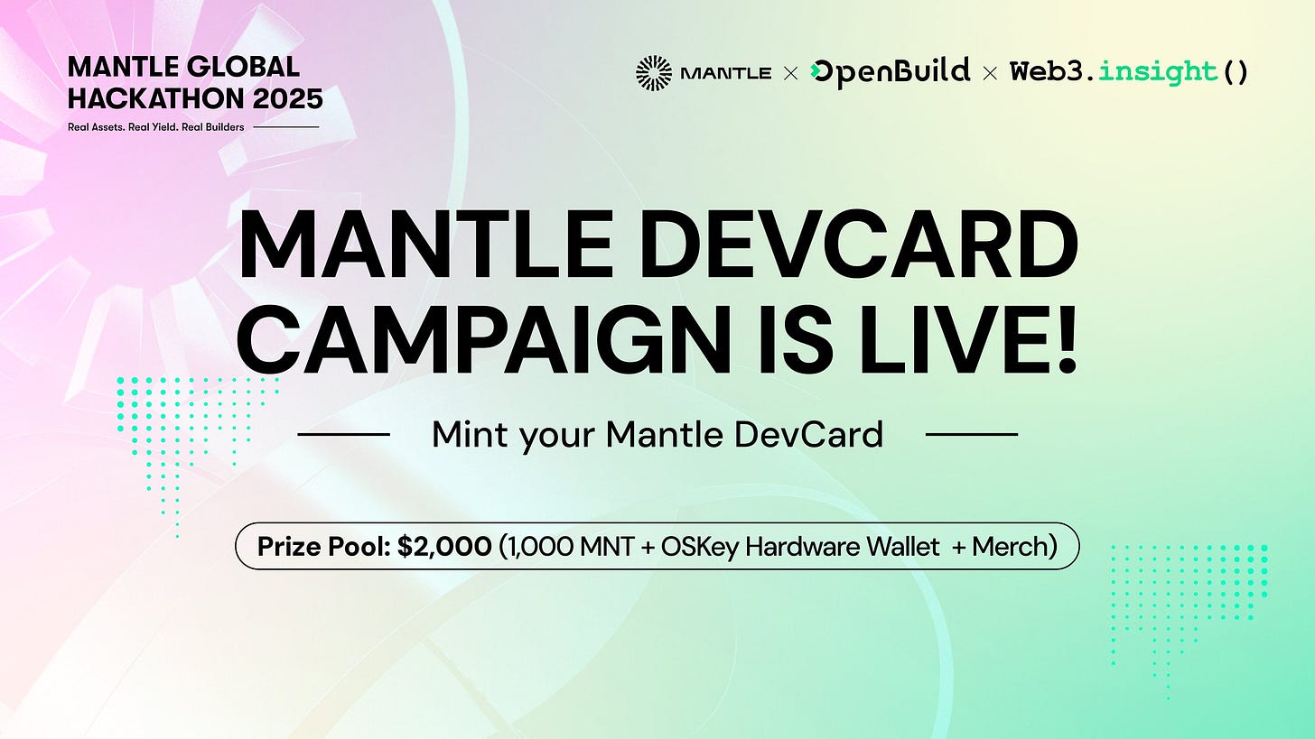 Web3insightは、DevCardなどを通じてビルダーの活動履歴や貢献を可視化するプロジェクトです。今回実施されたMantle DevCard Campaignでは、Mantle Hackathonと連動した3つの報酬プールを設計。