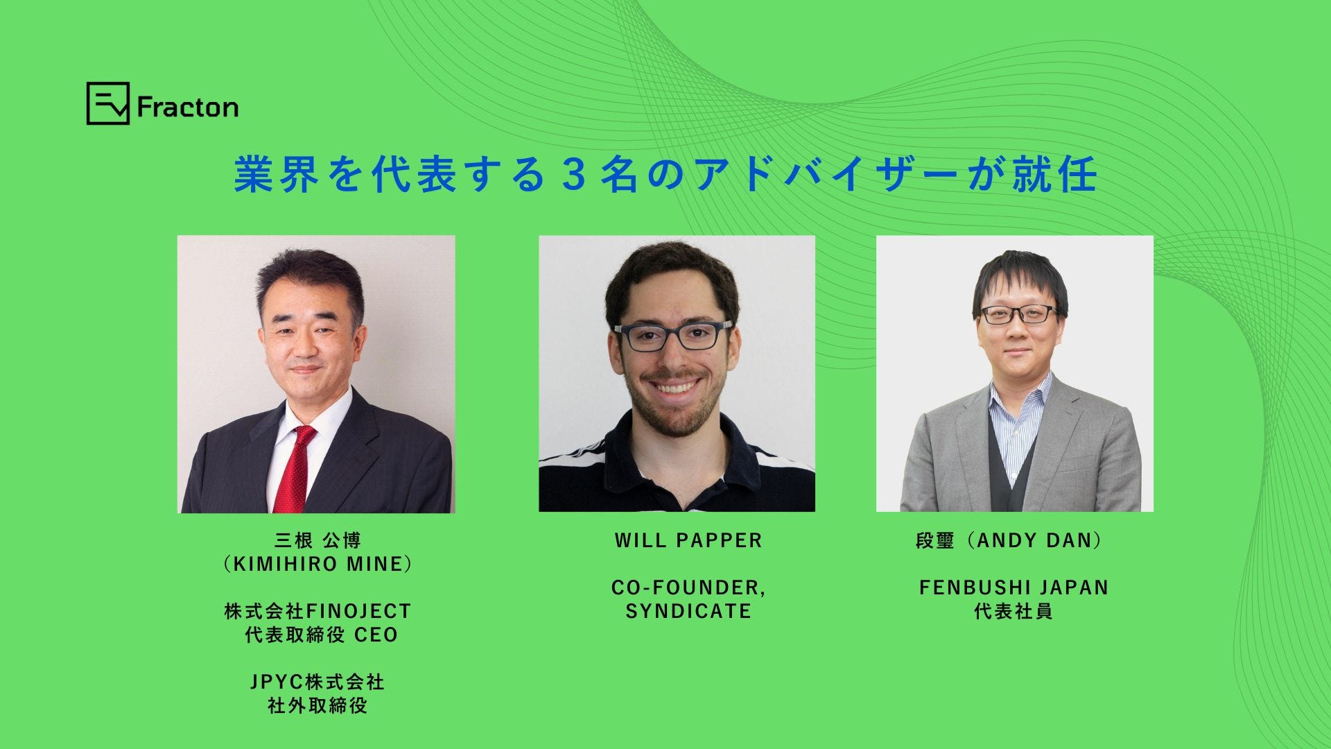 東京 — Ethereumを基盤としたインキュベーションおよび企業向けデジタルアセット戦略を展開するFracton Ventures株式会社は、本日、クリプトおよびデジタルアセット領域を代表する3名がアドバイザーに就任したことを発表しました。今回の就任は、Fracton Venturesが掲げる「企業がデジタルアセットを活用し、Ethereum上で価値を保有・循環させる社会の実現」を加速させるための戦略的な取り組みです。
