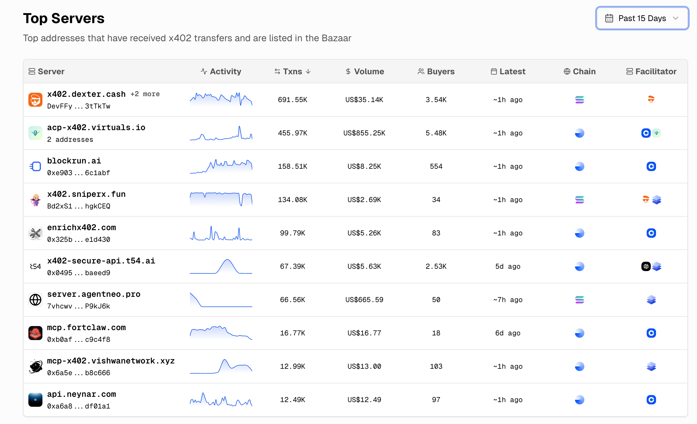 x402 Scanを見ると、直近15日のトラフィック量ではdexter, virtuals, blockrun.aiの順で多くなっています。